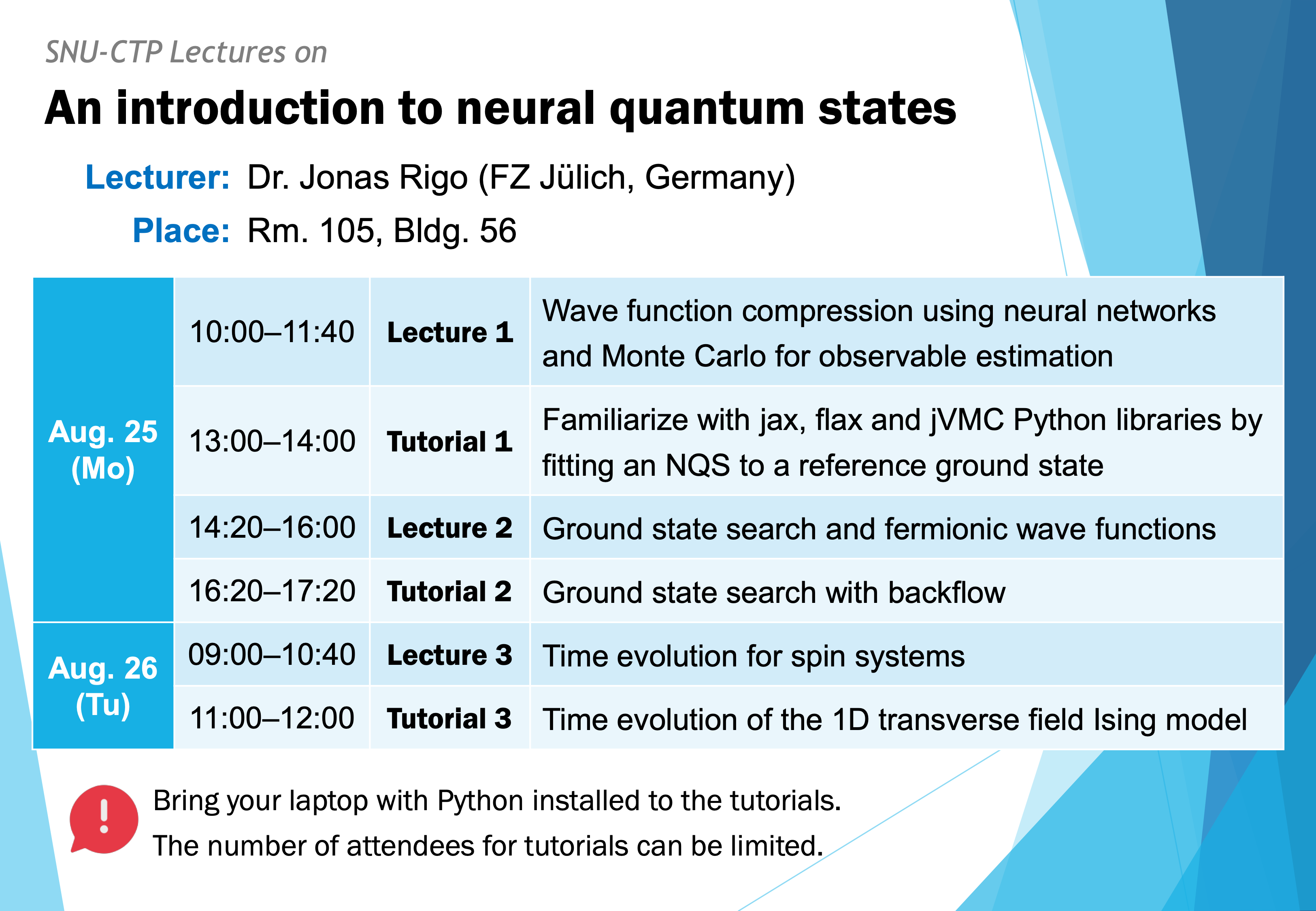 SNU-CTP Lectures on "An introduction to neural quantum states"포스터